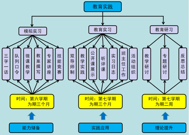 严格过程管理,打造高标准教育实践模式。建有稳定的教育实践基地,严把教育实践过程关,从前期准备到岗位实践,构建了层层推进与高质量把关的“三习”模式。学院教育实践分为三个阶段:模拟实习(含教育见习)、教育实习和教育研习。模拟实习内容包括:三字一话、常用口令、队列队形、课间操练习、PPT制作与说课、教案与教学设计的撰写、片段式教学与微课教学,以及师范技能测试、专家讲座等。模拟实习结束后会进行技能展示大会,检验实践成效。教育实习期间实行双导师制,对每个实习生的教案、听评课、实习日志、教学笔记、公开课展示等均有具体明确的要求。教育实习结束后学院统一召开教育实践总结大会,各实习队汇报模拟实习、教育实习和教育研习中所进行的教学活动、班级管理、课外体育活动组织、训练竞赛等工作成果,展示各队的组织管理、队刊、教案、实习日志等材料,大会聘请专家对各实习队成果进行点评。多年来,学院学生教育实践受到学校领导与实习学校的高度评价。