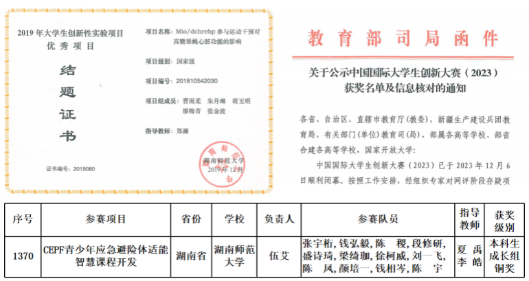 突出创新能力培养,构建学科融合与能力发展相促进的实验教学体系。以实验项目为牵引,结合创新创业教育与实践教育,构建了“两类型、三模块、五层次”的实验教学体系,实现了“实验教学、创新教育与实践教育”三个平台的协同发展,推动了实验教学向大学生创新创业实践的转化。学生主持的“CEPF青少年应急避险体适能智慧课程开发”获得2023年第九届中国国际大学生创新创业大赛总决赛主赛道本科生成长组铜奖;“以武铸魂青春当燃——探寻红色体育精神的时代传承”荣获2023年第十五届“挑战杯”湖南省大学生课外学术科技作品竞赛专项红色作品一等奖。2018-2023年期间学院获批立项国家级创新创业项目12项,省级创新创业项目11项,多个国家级项目以优秀结题。