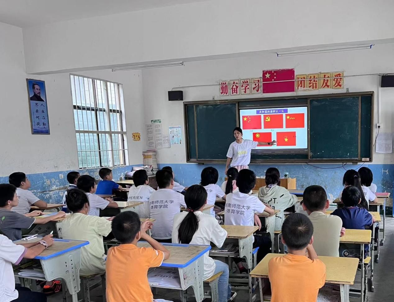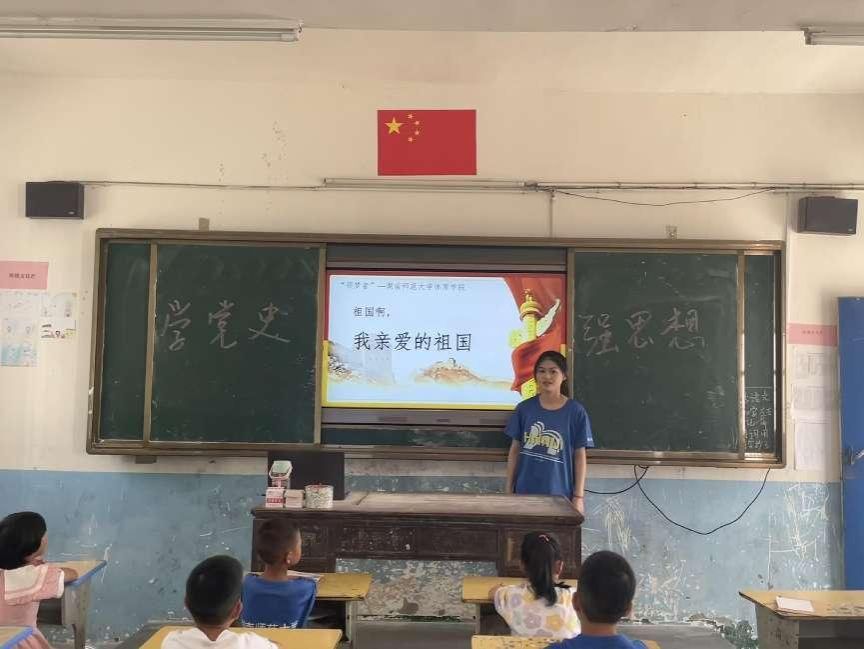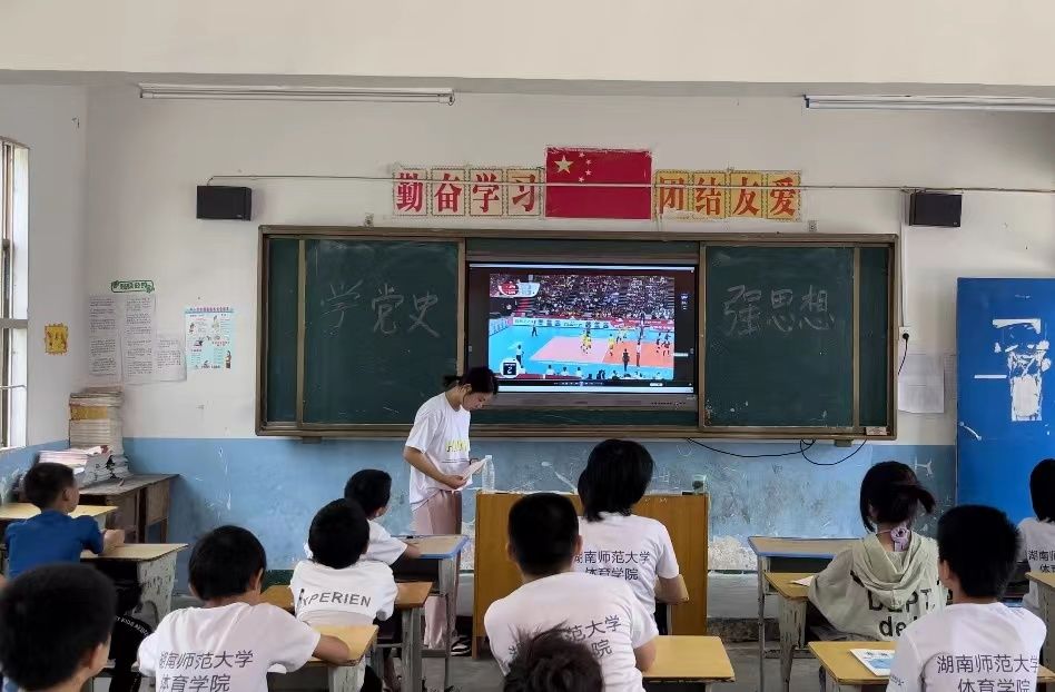 为引导小朋友们知党爱党、知史爱国,实践队开设红色课堂,向孩子们讲述“中国女排”的故事,感受女排热爱祖国、坚持不懈的精神,孩子们都被故事深深感染。课堂上实践队员还带领孩子们一起朗读诗歌《祖国啊,我亲爱的祖国》。希望通过几节党史课堂下来,强化三下乡中孩子们的思想政治教育和思想引领,促进红色基因传承人的培育。与此同时,帮助和引导广大三下乡中的学生上好与现实相结合的“大思政课”,在社会课堂中受教育、长才干、做贡献。