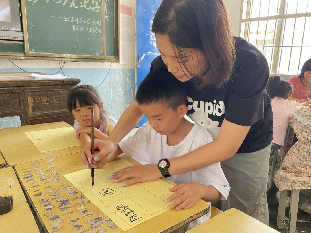 实践团采用书法课的形式,帮助孩子们写出更好的规范字。实践团成员介绍了汉字的起源、发展以及书法的基本概念。同时,向孩子们示范如何写好汉字和基本笔画。讲解并展示“按、压、勾、抵、挡”五步握笔的手法,指导孩子们操作。课堂上,学生对毛笔写字这一新鲜事物很感兴趣,都跟着老师的讲解在纸上认真的写着。课后合影时,同学们手持自己的作品也十分开心。通过课堂教学,孩子们在体验书法的同时,感受了汉字的深厚底蕴,书写能力也明显提升。