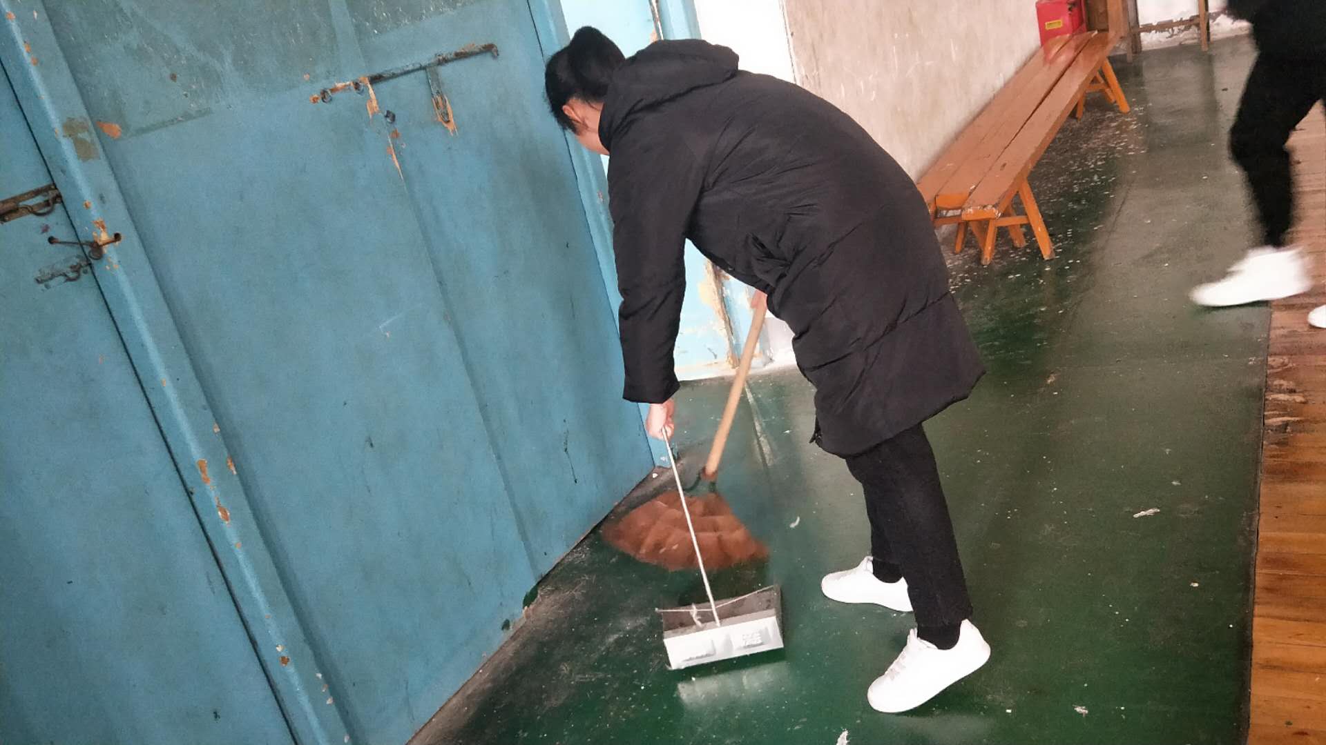 第六党小组主要负责老体操房、老排球馆和老篮球房的卫生打扫。活动开始,在组长的组织下,第六党小组一行前往老体操房、老排球馆及老篮球馆,服从安排,分工合作;男生负责各项体育器材的摆放,女生负责场馆垃圾的清扫。在活动过程中,大家相互配合,女生三人一个小组,一个人进行打扫,一个人协助打扫,另一个人负责拍照;男生五人一个小组,搬运大型体育器材,一人负责拍照。经过男女分工合作,大家高效率的完成了劳动任务。老体操房、老排球馆和老篮球馆的整体卫生变得更清洁、整齐。最后,第六党小组在老篮球馆进行合影留恋。