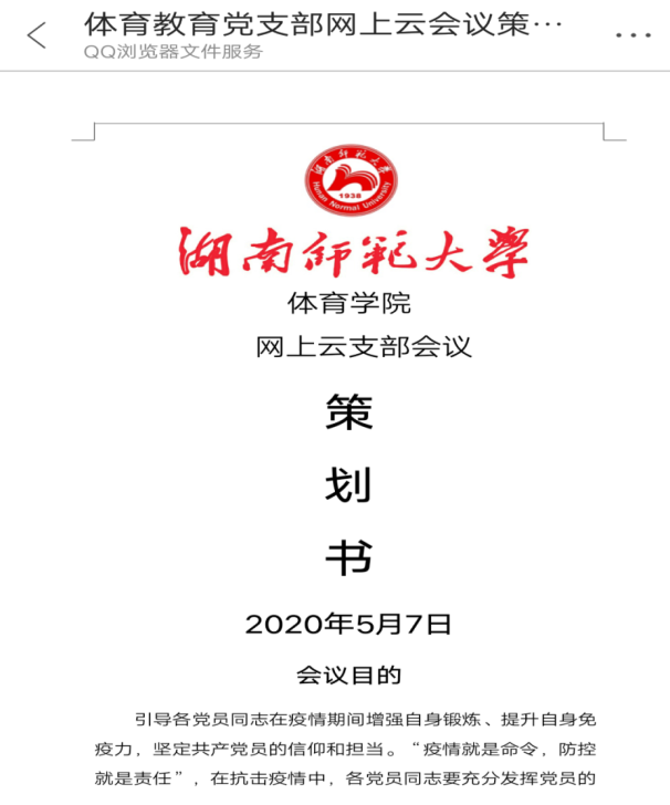 (通讯员 夏禹 杨金灵 杨卯)5月8日中午12点30,我院本科生体育教育党支部召开“疫情期间党员的自我‘修炼’”主题会议,会议由党支部书记夏禹老师、副书记陈凤同志主持,支部全体成员参与。