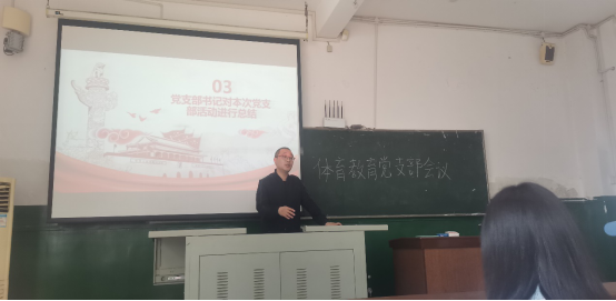 首先,体育教育党支部书记夏禹发表讲话,他指出党支部会议的重要性,对体育教育党支部党建活动的内容提出了建议与要求,并进一步规范了党支部会议的组织形式。