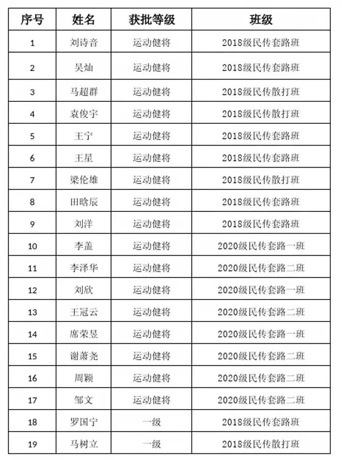 2021年11月9日收到中国龙狮运动协会下发关于《中国龙狮运动协会运动员技术等级管理办法(试行)》的通知,我校按照文件要求积极整理相关资料,加快推进舞龙舞狮运动员技术等级申报工作,在2018年—2021年相关赛事中,湖南师范大学龙狮团队共有32名同学荣获首批“龙狮运动员等级”称号,其中梁贤、马超群等30位同学获批“运动健将”称号,马树立等2位同学获批“一级运动员”称号。