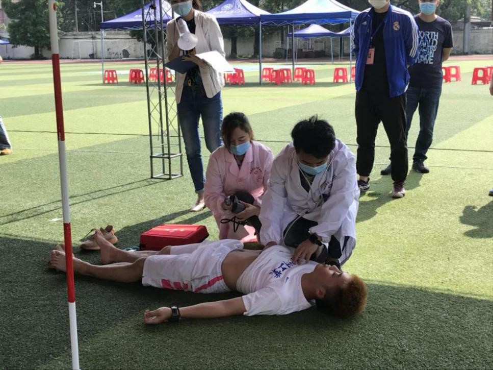 bwin必赢中国官网团委书记王静为本次演练进行现场解说。本次演练模拟考生报名时证件缺失、考生体温异常休息后恢复正常与仍然异常、考生中暑等场景,以期检验备考设施、考务工作与疫情防控等流程的合理性、安全性。演练围绕“分时错峰活动,减少考生聚集、流动”的应考原则,组织考生“点对点,分批次,一站式”参加体考,参与演练人员均为我校在校师生。