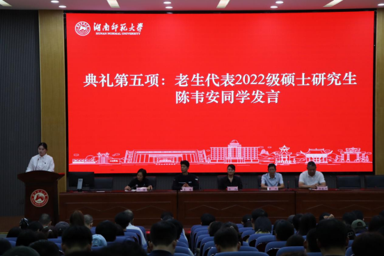 老生代表2022级研究生陈韦安发言,首先代表全体老生欢迎新生们的到来,并提出要主动面对研究生阶段丰富的课余生活,同时要夯实专业基础,不断拓宽知识面,勇于在传承中创新,时刻谨记“仁爱精勤”校训以及“厚载博学,行建自强”的院训精神。