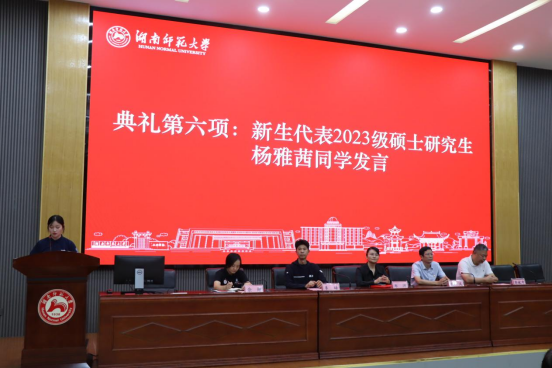 新生代表2023级研究生杨雅茜发言,提出新时代的研究生们应当致力于做到以下三点:一是明确目标,锲而不舍。要提前规划,在导师的认真指引下完成科研任务,以“咬定青山不放松”的韧劲,不达目的不放弃。二是夯实基础,增长知识。要有批判性思维,勇于质疑,敢于思辨,跨学科组合体育新论。三是勇往直前,坚守初心。成为新时代“复合型、创新型、高素质、国际化”的体育人才,投身我国体育事业发展的时代浪潮。