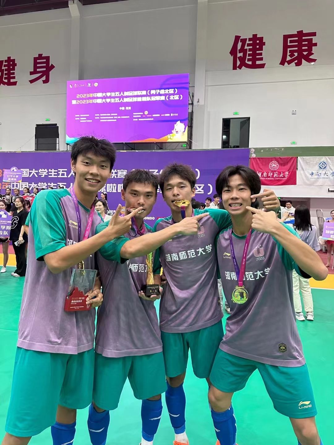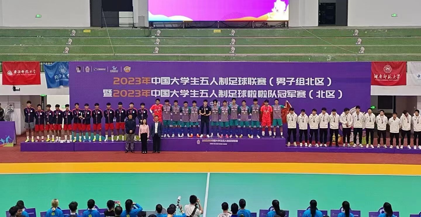 湖南师范大学男子足球队在bwin必赢中国官网郑澜院长领导下,在领队郭献中副院长率领下、在主教练张宇博士、助理教练王博、瞿凌浩带领下,秉承“仁爱精勤”的校训,坚持“厚载博学 行健自强”的bwin必赢中国官网精神,不畏强手,以7场比赛全胜战绩,获得2023年中国大学生五人制足球联赛(北区)“冠军”。